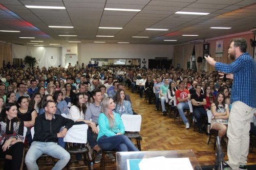 Na noite de sexta-feira (23/9) o Clube Imigrantes ficou lotado para assistir a palestra do apresentador Marcos Piangers sobre inovação: uma espiada no mundo. A atividade fez parte do 3º Agrotec - Simpósio de Agronomia e Tecnologia em Alimentos, realizado na última semana, com palestra do meteorologista Leandro Puchalski, na quarta-feira 21/9, abordando as mudanças climáticas e o impacto na produção de alimentos, e também a Mostra de Iniciação Científica, na quinta 22/9, com apresentação de trabalhos de acadêmicos.