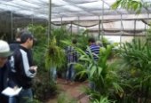 Em seguida o grupo seguiu ao viveiro a campo, localizado na Linha Laranjeira, onde são produzidas as plantas perenes. Ali, sob uma chuva fraca, os integrantes puderam visualizar o jardim residencial que, nas horas de “folga” entre os muitos afazeres, é cultivado e mantido pelas “mãos verdes” da Sra. Leonice. Eles foram recepcionados pelo Sr. Paulo Kramer, que proporcionou aos acadêmicos o contato e visualização de diversas situações práticas inerentes ao cultivo de plantas ornamentais, desde a diversificação ou especialização, aspectos operacionais, mão-de-obra, mecanização, abrigo em telado e comercialização. Esta, além do Ponto de Vendas, é realizada levando a produção em caminhão próprio às floriculturas do oeste catarinense, norte do Rio Grande do Sul e sudoeste do Paraná.