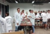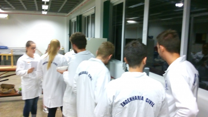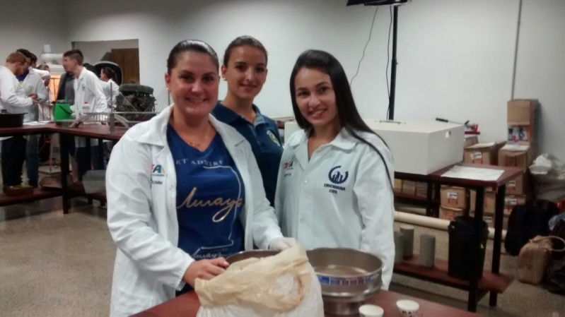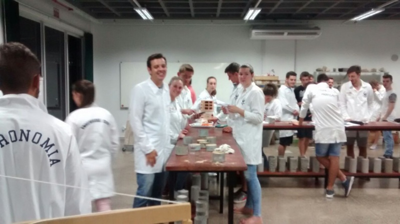 Foram realizados ensaios de teor de umidade pelo método da estufa, frigideira e queima com álcool, sendo estes dois últimos mais utilizados na prática do canteiro de obras. O professor explica que este teste de umidade é importante para determinar a quantidade de água a ser adicionada em uma mistura de concreto por exemplo, ou mesmo, para realização de compactação de obras de terras, como terraplanagem e na construção de base para pavimentação.