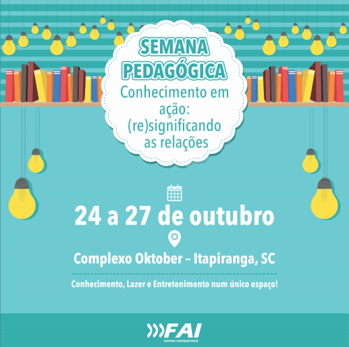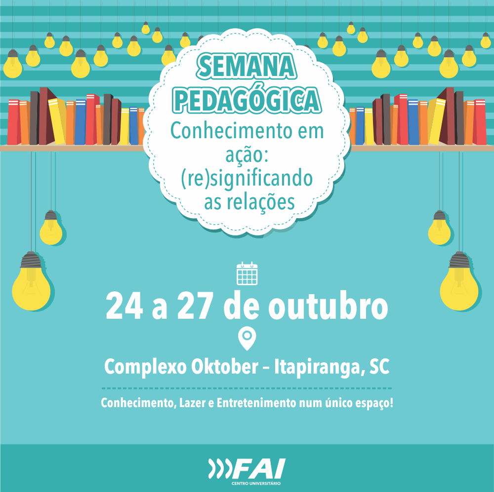 A Semana Pedagógica será realizada de 24 a 27 de outubro no Complexo Oktober e tem como organizadores o curso de Pedagogia da FAI e a Biblioteca Municipal Rui Barbosa. O evento conta também com o apoio do Sicoob, Gerências Regional de Educação, Secretarias Municipais de Educação, Ensino Normal Médio (Magistério) e Livrarias.