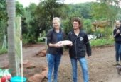 Em seguida o grupo seguiu ao viveiro a campo, localizado na Linha Laranjeira, onde são produzidas as plantas perenes. Ali, sob uma chuva fraca, os integrantes puderam visualizar o jardim residencial que, nas horas de “folga” entre os muitos afazeres, é cultivado e mantido pelas “mãos verdes” da Sra. Leonice. Eles foram recepcionados pelo Sr. Paulo Kramer, que proporcionou aos acadêmicos o contato e visualização de diversas situações práticas inerentes ao cultivo de plantas ornamentais, desde a diversificação ou especialização, aspectos operacionais, mão-de-obra, mecanização, abrigo em telado e comercialização. Esta, além do Ponto de Vendas, é realizada levando a produção em caminhão próprio às floriculturas do oeste catarinense, norte do Rio Grande do Sul e sudoeste do Paraná.